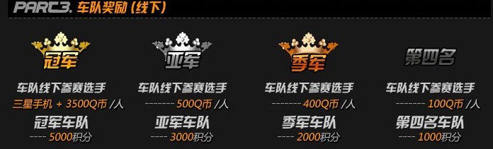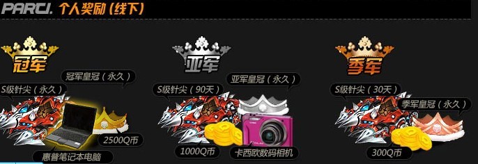 2010WCG个人赛冠军将获得最为珍稀的荣耀之证“永久冠军皇冠”、《QQ飞车》最顶级赛车“永久S级针尖”、高级惠普笔记本电脑和2500Q币;车队赛冠军成员也均可获得极为珍贵的“冠军皇冠”、精美三星手机和3500Q币!丰厚巨奖花落谁家?让我们拭目以待吧!丰厚的Q币、海量的积分、璀璨的永久皇冠、顶级酷炫锋芒毕露的奢华名车S级【针尖】和卡西欧数码相机将犒赏飞车勇士!让皇冠的荣誉永远属于您,让飞车实物大奖帮您纪念这段激情燃烧的岁月,祝贺您梦想花开愿望成真!