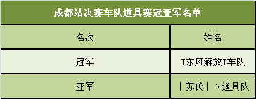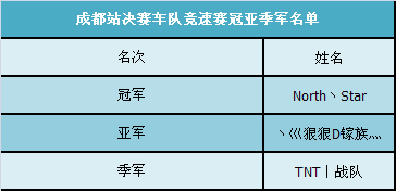 成都站决战SSC决赛个人赛与车队赛最终名次如下: