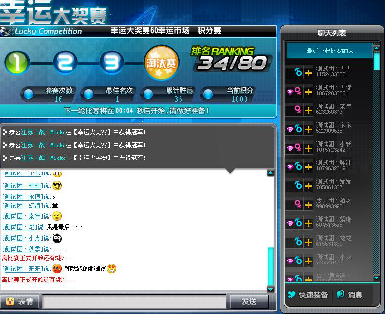 幸运大奖赛分为积分赛与淘汰赛2个阶段。积分赛初始分数1000分,包含3场比赛,你需要在每场比赛中尽可能的与对手拉开距离,从而获得更高的积分。3轮积分赛结束后,积分最高的前32名将晋级淘汰赛。