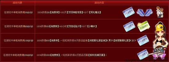 活动说明:根据开通紫钻的月数免费获赠道具,开通时间越长、获赠道具价值越高,最高可获得包含A车维纳斯的168QB的大礼包一份。