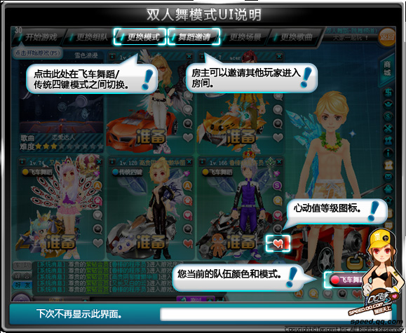 在游戏中时,游戏界面右侧的默契槽会随着您与舞伴的配合,逐渐增长,当默契槽满的时候,背后会出现一个很炫的金色爱心哦!还有Showtime和lovetime,这是您与舞伴展现自己的好机会,美妙的舞台定能让你陶醉其中!