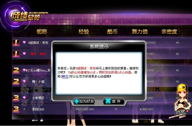 双人舞模式除了可以展现您超凡的舞技外,说不定还可以为您创造一段浪漫情缘哦!当您遇上心仪的ta后,如果羞于开口,便可以在双人舞模式中的结算环节向ta表白示爱噢!