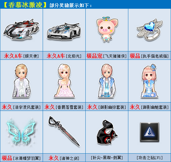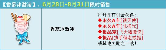 活动方式:在商城直接购买“香慕冰激凌”,打开即有机会获得永久A车【银天使】、永久A车【北极光】、极品宠【飞天猪猪侠】、极品【执手偕老戒指】、极品【浩宇凌风/香腮落雪套装】、极品【御影幽弥/御影幽魅套装】或其他奖励之一。