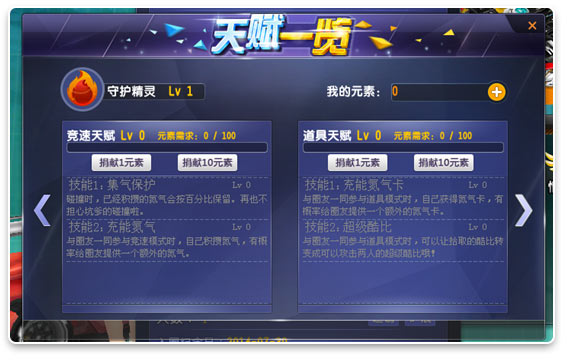 竞速天赋技能1:集气保护,在竞速模式下与圈友在同一单局,碰撞时氮气按一定百分比保留