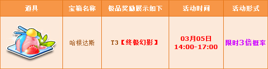 3月5日14:00-17:00期间,购美味【哈根达斯】,独享宝箱3倍惊喜,宝箱产出极品T3【终极幻影】的几率也翻3倍,机会不容错过!