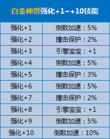 技能二:引擎宝宝:可以成为您的引擎宝宝,守护着你,让您的赛车引擎动力更强。对比于赛车改装,最高等级可提供引擎+7。