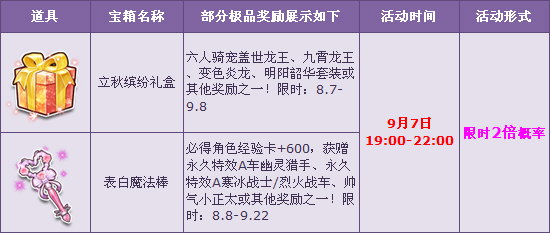 9月7日19:00-22:00期间,【立秋缤纷礼盒】【表白魔法棒】两款道具开启限时2倍产出模式,6人骑宠限时抢,千万不要错过哦!