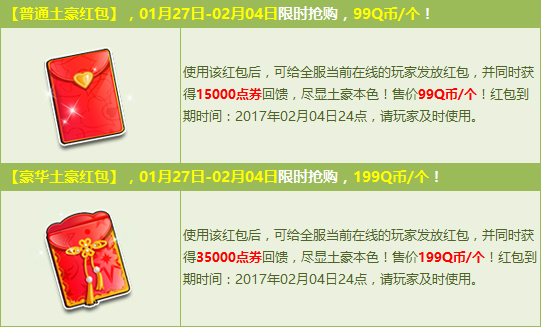 新春福利嗨不停,豪华土豪红包雨来袭!1月27日-2月4日,快来和全服小伙伴分享点券大礼,还有点券大礼包回馈,一起来**!
